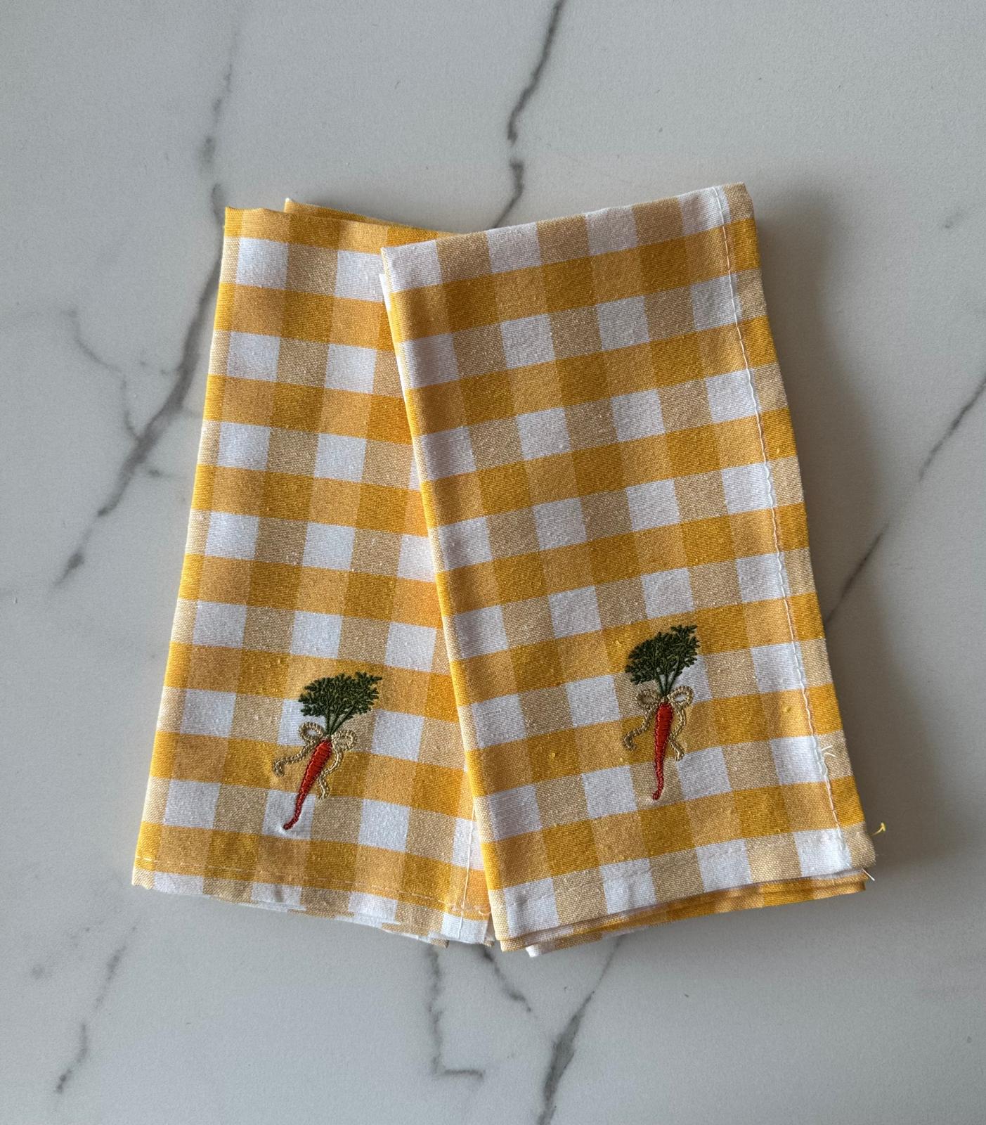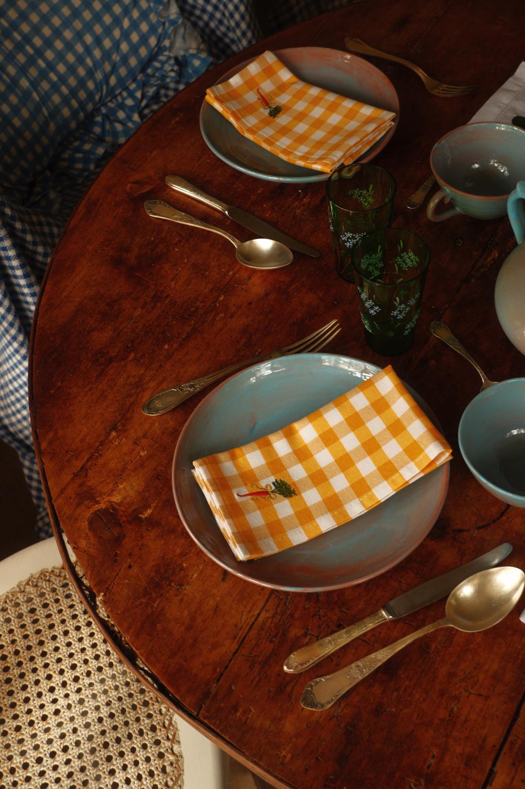 Deze gele vichy print met wortel tekening brengt de lente mee wanneer je hem op tafel legt.