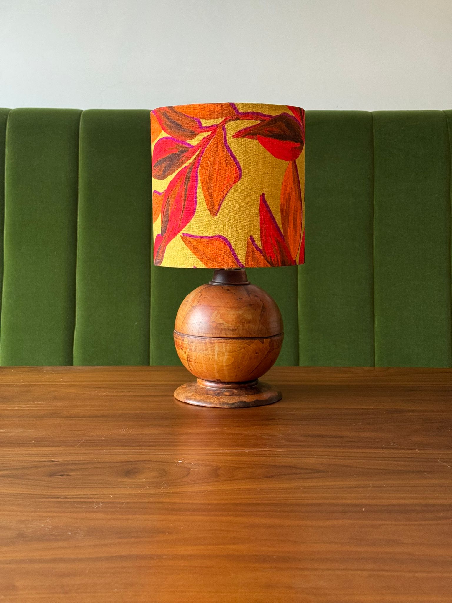 Walnut Flower Lamp heeft een gerestaureerde vintage houten voet gecombineerd met een fleurige kap.